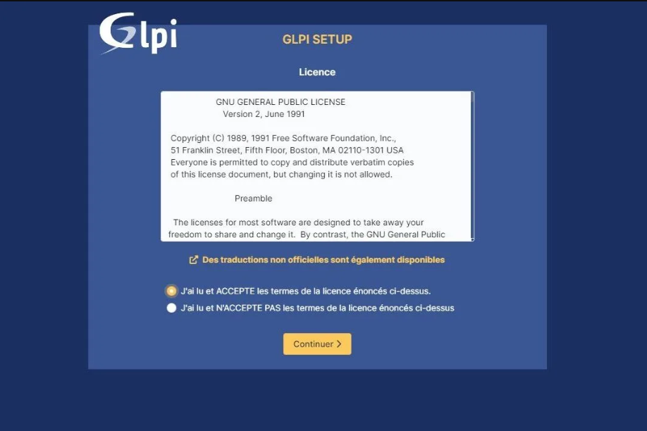 Il vous faudra ensuite accepter les termes de la Licence de GLPI.