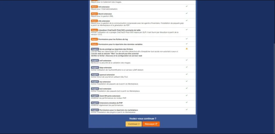 Un check des prérequis est fait, tout est coché hormis un petit triangle orange au milieu. L'erreur est normale, c'était déjà le cas sur GLPI 9, vous pouvez poursuivre l'installation