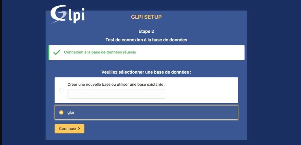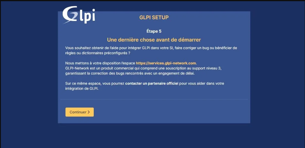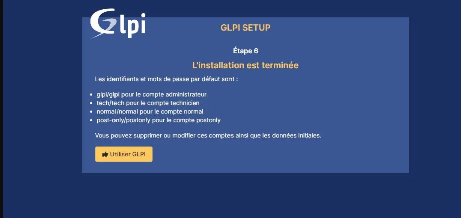 L'installation est terminée, cliquez sur continuer puis utiliser GLPI