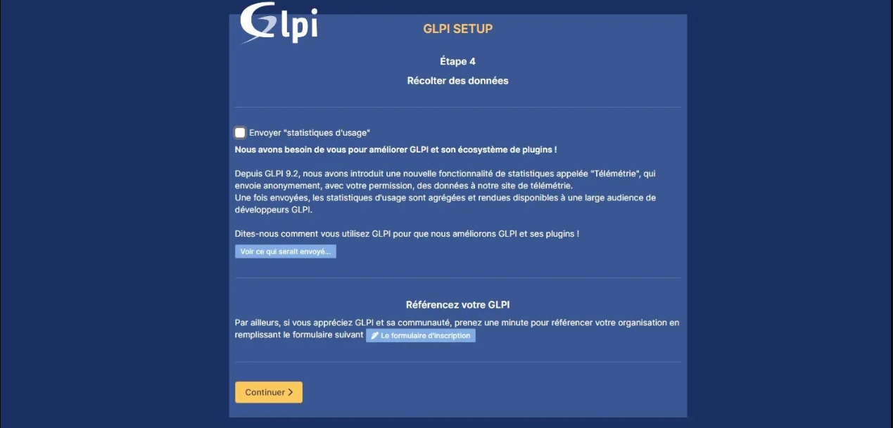 Ensuite vous pouvez choisir si oui ou non vous souhaitez envoyer des statistiques d'usage à GLPI.