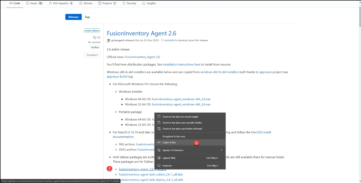 Le lien du fichier fusioninventory-agent-X.Y-all.deb (voir 1), faire un clic droit et cliquer sur Copier le lien (voir 2)