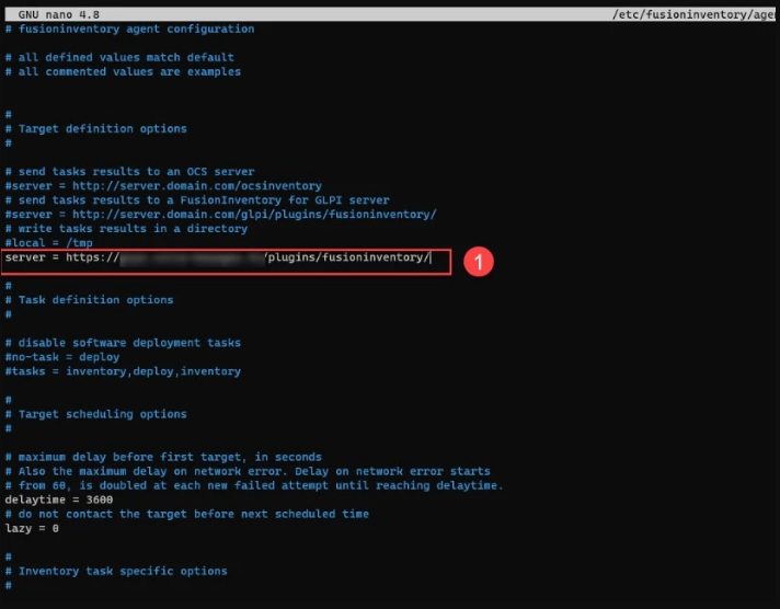 Pour fonctionner, il faut à minima ajouter le paramètre server avec l'url du plugin FusionInventory 1.
